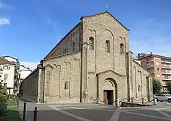 The layout we see today was built in the 11th century at the site of a late 6th-century paleochristian church located just outside the city walls. It had three naves with an octagonal bell-tower at the southern apse. The simple brick facade has protruding pilasters and shows a trend towards verticality. After 1720, with the closing of the monastery, part of the church was rededicated to the Addolorata. It underwent major restoration after the First World War, that stripped much of the decoration, giving the interior a white-washed simplicity.[1] The apse and the base of the bell-tower retain medieval traces.