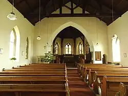 The church is built of rubble, with stone dressings, and a slate roof. It consists of a four-bay nave, an apsidal chancel, a western bapitstry, a south porch, and a north vestry. The windows are lancets, while the entrance has a Tudor arch. There is a bellcote at the western end, with a ball finial. There is a king post roof.[2] Inside, the pews are made of wood from Lawkland Wood, and some have racks designed for top hats beneath them.[3]