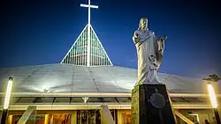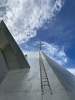 The Church of the Gesù is the Roman Catholic church of the Ateneo de Manila University campus in Quezon City in the Philippines. It is under the jurisdiction of the Diocese of Cubao. The church was designed by Jose Pedro Recio and Carmelo Casas. The edifice's massive triangular structure symbolizes the Holy Trinity, as well as the three-fold mission and vision of the school. Its shape and design are also meant to suggest the outstretched arms of the Sacred Heart, and the traditional Filipino bahay kubo (nipa hut). The site has a total area of 10,200 square metres (110,000 sq ft) and seating capacity for 1,000 persons. The church is situated on Sacred Heart Hill, a small hill overlooking Bellarmine Field, believed to be the highest point in barangay Loyola Heights. In its immediate vicinity are the dormitories (Cervini and Eliazo Halls) and the John Pollock Renewal Center. The peak cross and carillon (see below) of the church can be seen from Katipunan Avenue, which borders the campus to the west.