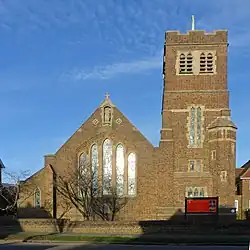 The church became parished on 13 October 1922. The new parish was formed from the section of Preston parish west of the Brighton Main Line, previously within the jurisdiction of St John the Evangelist's Church, and part of the parish of St Luke's Church on Old Shoreham Road. The population of the area was about 4,000.[10][11] The east end of the church (the rear of the building) was extended in 1927.[4][6][12][13] The same building firm was used again, and they added a chancel, vestry, Lady chapel and one extra bay on the nave.[14] A square tower was also added at the front (west end), and the church was dedicated in its new form on 23 June 1927.[15] A new church hall was built in 1936 to replace the former iron church, which had latterly been used as a church hall.[4]
