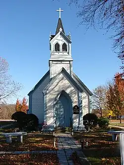 A 1-story, end-gable, Gothic Revival structure with patterned-shingle sides, a projecting pedimented entry, square belfry in front and stained-glass Gothic windows.