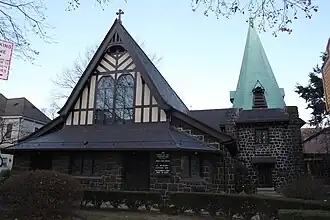 The Church of the Resurrection is a historic Episcopal church and rectory in Richmond Hill, Queens, New York City. It was originally built in 1874 as a frame, Gothic Revival style church. It was extensively remodeled and enlarged in 1904 in the Late Gothic / Tudor Revival style. It has an exterior of random quarry-faced stone and a prominent bell tower with spire. The church includes the Riis family memorial window, donated in 1905 by Elizabeth Riis, wife of Jacob Riis. The adjacent Cummings Hall was built in 1923. The rectory was built in 1888 and is a 2+1⁄2-story, frame dwelling with a hipped roof and gable dormers in the Queen Anne style.[2]