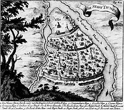 After a heavy fire in 1668 the walls of the posad were relocated to the east, and consequently the Spasskaya gate tower was moved from the Kremlin to the place of the burnt up Znamenskaya tower of the Ostrog walls;[5] today it would be lying between the crossroad of the Republic and Chelyuskintsev Streets. The new walls of the posad at the future Irkutsk Street (now the Chelyskintsev Street) stood undamaged until another fire erupted in 1766.[8] At the same time on a drawing of Tyumen between 1668 and 1695 from Nicolaas Witsen's book Northern and Eastern Tartaria and on a draft of the town around 1700, found by Golovachov in Gerhard Friedrich Müller's portfolio,[5][9] the All-Merciful Church is seen in the same area near the Kremlin.