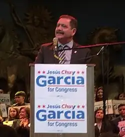 Jesús G. "Chuy" García (/ˈtʃuːi/ CHOO-ee; born April 12, 1956) is an American politician serving as the U.S. representative for Illinois's 4th district since 2019.[1] A member of the Democratic Party, he served on the Cook County Board of Commissioners, as well as in the Illinois Senate and on the Chicago City Council before his election to Congress. He was also a candidate for mayor of Chicago in 2015 and 2023. Throughout his career in Chicago and national politics, he has been described as a progressive.[2]