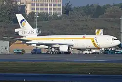 Cielos Airlines, commonly known by its old name Cielos del Peru S.A., was a cargo airline based in Callao, Peru. It operated scheduled, ad hoc and contract charter domestic and international cargo services. Its main base was Jorge Chávez International Airport.[1] The company slogan was Spanish: para ayudarlo a llegar lejos, To help you get far.