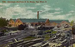 Another short segment of the future Cincinnati Northern was built by the Celina, Van Wert and State Line Extension of the Columbus and North–Western Railway, incorporated in May 1878 for the purpose of building a line from Celina north to the state line in Williams County.[5] Near the state line it would meet the Columbus and North–Western Railway, which had been incorporated in 1872 to build from Columbus to the state line in that same county,[6][7] but was never constructed. The line was built to 3 ft (914 mm) narrow gauge to connect with the growing Toledo, Delphos and Burlington Railroad (TD&B), opening from Van Wert south to Ohio City on the TD&B in August 1879, to the Mercer County line in January 1880, and to Rockford in September 1880, for a total of 13 miles (21 km).[8] At Rockford, it connected to another TD&B branch, which had been completed from Delphos in December 1878; the TD&B finished a line (later part of the main line to Dayton) from that branch at Mercer south to Celina in November 1880. Thus the Celina, Van Wert and State Line had helped to form a line south to Celina, but it ended at Van Wert in the north.[9]