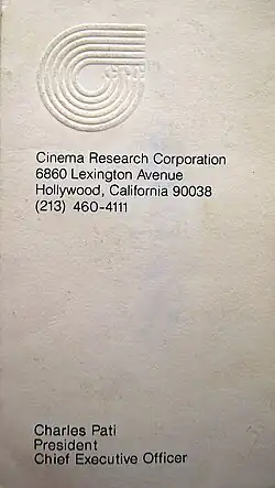 Cinema Research Corporation was founded in 1953 by Charles Pati from Brooklyn, New York. He moved to California at the age of 40 with the dream of getting involved with the film industry in Hollywood. By 1954, he had his first title, The Black Pirates, for which he created the special effects. By the end of that decade, he owned the largest special effects studio in Hollywood. His company, Cinema Research Corporation did titles, opticals, trailers, and special effects.[3]