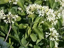 The plants are woody-stemmed, either upright or twining with numerous herbaceous sprawling stems and poisonous milky sap. The leaves are bright green and broadly ovate, 7–12 centimetres (2+3⁄4–4+3⁄4 in) long and 4–8 centimetres (1+9⁄16–3+1⁄8 in) wide. Large clusters of delicate fragrant white flowers are borne terminally from April to June. The plants bear fruits 8 centimetres (3+1⁄8 in) long, with a papery flap. The seeds have a wide marginal wing all around with a terminal tuft of long white silky hairs. Because it is a poisonous plant, goats and sheep do not approach it.[2]