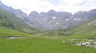 The Cirque d'Estaubé is a cirque in the central Pyrenees in the Pyrenees National Park, forming the frontier between France and Spain. The cirque lies 4 km to the east of its better known neighbour, the Cirque de Gavarnie, which is accessible via the Hourquette d'Alans (2,430 m); the Marboré valley is reached via the Brèche de Tuquerouye (Tuca Arroja) (2,666 m), where there is a small CAF hut.