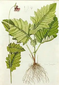 C. foliis amplis ovatis angulato-denttis ciliato-ſerratis ſcabris, inferioribus petiolatis baſi auriculatis, ſuperioribus amplexiculibus, pedunculis elongatis 3floris, ſquamis anthodii glutinoſi patulis. Hungaria.