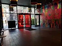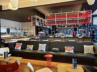 The 10-story, 272-room hotel opened in TD Garden's The Hub on Causeway on August 5, 2019,[2][3] and has a 9,600-square-foot common area. It was designed by Concrete Architectural Associates, Gensler; Moriarty served as the contractor. The interior features artwork by local artists[4] There is no concierge desk, and guests use kiosks for self-checkin.[5] The hotel was CitizenM's third in the United States.[6] It has been described as a "micro" hotel,[7] with "pod-like" rooms.[8]