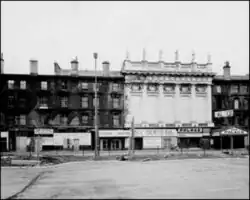 Following a fire, an order was made with little warning for the destruction of the Palace Bingo Hall (née Theatre) in 1977. Staff of the Citizens arranged a stay of execution to rescue the best of the Victorian fittings, including the six statues which stood atop the columns.[25] Following these works, almost the entire tenement block which had sat in front of the auditorium was razed, leaving the Citizens' foyer as the only remaining piece[26] In an article for the Guardian newspaper, Bunny Christie described the theatre in this period as "[sitting] on its own, surrounded by potholes and puddles, everything else seemed to have been pulled down."[27]
