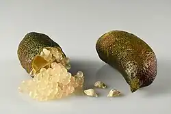 | Finger lime fruits - whole and one with juice vesicles and seeds partially extracted | |