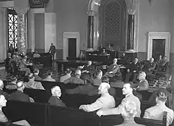 On July 1, 1925, Los Angeles voters passed a new city charter and replaced the at-large system with a district system with fifteen new single-member districts.[35] Each district was to be approximately equal in population, based upon the voting in the 1922 California gubernatorial election, and would redistrict every four years. The numbering system established for the City Council districts began with the 1st district in the San Fernando Valley and ended with the 15th district in the Los Angeles Harbor Region. In 1928, the new Los Angeles City Hall was completed, and the City Council moved to a room there from the previous Romanesque Revival building used.[36][37]