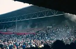 The Main Stand was re-roofed, extended and refurbished between 1962 and 1965,[35] with new offices, changing rooms, kit stores, medical suites and press rooms to the rear.[39] On 24 August 1968, however, fire broke out in the stand during a First Division game against Leeds United.[40] It started near the dressing rooms and spread rapidly through the largely wooden structure.[28] The stand was damaged but, despite a crowd numbering 31,126, none of them was injured.[40] The only reported injuries were to a television crew on the gantry, who had to scramble down it because the access ladder was stored in the boiler room. The gantry was extended the length of the stand and now has access at both ends. Many of the club's records, trophies and other memorabilia were also lost in the fire.[28] The stand's roof was undamaged, however, allowing the club to rebuild the base of the stand underneath it in concrete and steel.[19] As a result of the fire, Forest played six "home" matches at Meadow Lane, losing all of them,[19] and after returning to the City Ground used the changing rooms of nearby Trent Bridge while the Main Stand was rebuilt.[41]