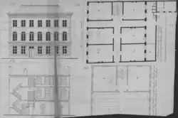 In July 1853 the Provincial Society for Art and Sciences Provinciaal Genootschap van Kunsten en Wetenschappen, the City Gymnasium and the municipality made a plan for a new building. It would house the gymnasium and the great library and cabinet of curiosities of the society. The municipality approved and offered to contribute 6,000 guilders.[14] In July 1854 the provincial authorities approved to contribute 3,000 guilders for building the rooms for the society library.[15] Meanwhile, the cost rose to 14,305, which substantially increased the cost for the municipality. In September 1854 the order for construction of the new school was given.[16]