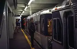 City Hall is one of the least utilized stations on the PATCO line. Originally constructed with long corridors under 5th Street leading to both Arch Street and Cooper Street, the station featured separate entrances at the north and south corners of Cooper Street and 5th Street. However, due to consistently low ridership, these corridors have been closed.[5] There are three stairways at the northeast, southwest and southeast corners of Market Street and 5th Street. The northeast stairway is designated for emergency use only. The stairway at the southeast corner (inside Roosevelt Park) opened in 2023 as part of a PATCO project to improve accessiblity at the station. An elevator was also added at southeast corner along with an elevator connecting the platform and mezzanine.[6][7]