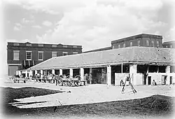 City Market is a historic market complex in the Historic District of Savannah, Georgia. Originally centered on the site of today's Ellis Square from 1733,[1] today it stretches west from Ellis Square to Franklin Square.[2][3] Established in the 1700s with a wooden building, locals gathered here for their groceries and services.[1] This building burned in the Great Savannah Fire of 1820 and was replaced the following year with a single-storey structure that wrapped around the square.[4] "It was a wooden shed, about twenty-five feet wide," remembered historian Charles Seton Henry Hardee, who moved to Savannah in 1835. It had a shingle roof, supported by brick pillars. An uncovered section was used for the sale of live poultry and seafood. The covered area was mainly used for the sale of vegetables and dressed poultry.[5] A brick building, the work of architects Augustus Schwaab and Martin Phillip Muller, was erected in 1876.[4] They had submitted plans to the city six years earlier. The cost of the building's construction "vastly exceeded expectations" after excavations revealed weakened arches in the basement floor that required them to be replaced.[6] It was an ornate structure with arches in the Romanesque style and large circular windows.[7]