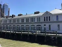 Pier A, also known as City Pier A, is a pier in the Hudson River at Battery Park in Lower Manhattan, New York City. It was built from 1884 to 1886 as the headquarters of the New York City Board of Dock Commissioners (also known as the Docks Department) and the New York City Police Department (NYPD)'s Harbor Department. Pier A, the only remaining masonry pier in New York City, contains a two- and three-story structure with a clock tower facing the Hudson River. The pier is a New York City designated landmark and is listed on the National Register of Historic Places (NRHP).