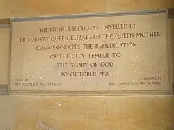 During The Blitz, the City Temple was "gutted by fire from incendiary bombs dropped from enemy aeroplanes". Weatherhead was able to continue his ministry thanks to the nearby Anglican St Sepulchre-without-Newgate church. After the war, Weatherhead raised the funds to rebuild the City Temple, largely from John D. Rockefeller Jr. The rebuilt City Temple was opened in the presence of Queen Elizabeth The Queen Mother in 1958. Weatherhead retired in 1960. 51°31′1.62″N 0°6′21.92″W / 51.5171167°N 0.1060889°W