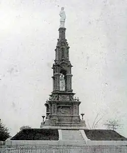 The idea for a public Confederate memorial in Savannah, Georgia began to gain traction in 1869, shortly after the relocation of Georgian soldiers killed at the Battle of Gettysburg to Laurel Grove Cemetery. Following this, the Ladies' Memorial Association in Savannah began to hold fundraising events, such as bake sales, raising almost $25,000 for the construction of a Confederate monument.[3] While the association originally planned for the monument to be located in the Confederate section of Laurel Grove Cemetery, they ultimately decided to erect it in Forsyth Park. This decision proved controversial with many in the general public, who pointed out that Forsyth Park was, at the time, on the outskirts of the city, but the association contended that the statue would be overshadowed by trees and surrounding architecture if it was placed in any of the squares of Savannah.[4] A public meeting at Independent Presbyterian Church in May 1874 settled the issue of location in favor of Forsyth Park.[4]