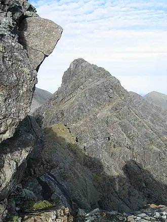 Clach Glas is a mountain on the Black Cuillin of the Isle of Skye, Scotland. Its elevation is 786 m (2,579 ft) and the name translates as The Grey Stone. It is often traversed as a sustained scrambling route to Blà Bheinn, mostly at a standard between Easy and Moderate, depending on the line followed (see Parker, routes 101 & 102). It is the penultimate mountain in the Greater Traverse of the Black Cuillin.
