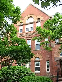 The Claflin School is a historic former school building at 110–112 Washington Park, Newtonville, Massachusetts. It is a 2+1⁄2-story brick building, with a tall hip roof, projecting side-gabled wings, and a tall central gable section. The main facade is symmetrically arranged, with brick quoining around windows and corners, and entrances set in round-arch openings. Named for William Claflin, it was built in 1891, and is a well-preserved example of Richardsonian Romanesque design. Its architect was Merrill J. Brown.[2]