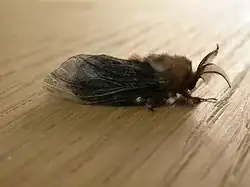 Adult males have wingspan of about 30 mm. The female is wingless.