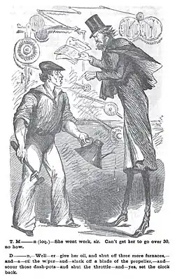 Jerome's account, including his cited average speed of only 0.5 miles per hour (0.43 kn; 0.80 km/h), was corroborated by two further letters to the Times, from E. Riggs and Clara Clarita's commander, Captain Alex Smith.[4] In his response, also published in the Times, Dickerson did not deny the abysmal performance of his engine adaptation, confining his comments instead to a denial of the charge that he had lied in his previous letter.[10] The spectacular failure of the engine was not lost on Dickerson's enemies in the Navy Department, some of whom quickly published a satirical piece on him entitled Uncle Samuel's Whistle And What It Costs.[12] The piece was later reproduced in Frank M. Bennett's book The Steam Navy of the United States.[13]