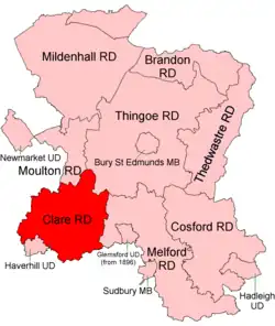 Clare Rural District was a rural district in the county of West Suffolk, England. It was created by the Local Government Act 1894, comprising those parishes in the Risbridge rural sanitary district which were in Suffolk.