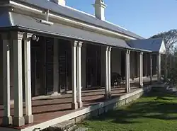 The house is symmetrically arranged with French doors opening onto the verandah, which extends around the sides of the house. There is a stone paved verandah at the rear. The verandah roof has been reconstructed to its original form of a concave profile roof supported by simple posts on plain plinths.[1]
