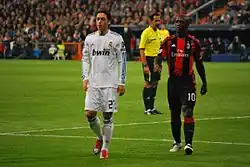 A world class midfielder, in addition to his fitness and athletic characteristics, as well as his ability to break down opposing plays and win back possession,[51][52] he was an elegant, creative player and an excellent dribbler, possessing outstanding technique, ball skills and vision, which enabled him to retain possession when under pressure and subsequently lay the ball off to an on-rushing teammate;[57] he was also an accurate passer and crosser of the ball.[51][53][58][59] Seedorf was also capable of scoring goals due to his powerful, accurate striking ability from distance with either foot;[51][52][60][61] furthermore, he was an effective free kick taker.[62] Despite his physical, energetic, and tenacious style of play, Seedorf was regarded as a player with good behavior, and was sent off only two times in his entire career. In addition to his success and footballing skills, Seedorf has also been praised for his longevity as a footballer.[51]