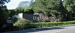 Mayhew designed his own house in collaboration with Serge Chermayeff, associate architect and employee of Mayhew's during 1940–1941 when Chermayeff was also teaching at California School of Fine Arts. Chermayeff was brought in so that Mayhew would not have his own wife for a client.[8] The house contrasted sharply with existing homes on Hampton Road, and appeared to be made of rectangular shapes descending the sloped property. The house divided into two functional groups, one for adults and one for children, with all living and sleeping rooms facing south. Glass walls were specified to allow maximum sunlight and viewing pleasure.[12] The two main structural units enclosed a private garden and were connected by a broad stairway enclosed against the weather, with the street side made of solid wood and the garden side fully glazed. The three children's rooms were separated with demountable hanging walls that could be changed to adapt to the family's needs. Author Alan Hess wrote in 2007 that the clean abstraction of the rectilinear blocks appeared to be based on Chermayeff's Bauhaus leanings but that the casual, site-specific interaction of garden, house and modernity showed the relaxation of California living apparent in Mayhew's prior work.[8]