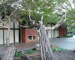 Mayhew's influential Manor House was designed in 1937 for Marjorie and Harold V. Manor. Manor was a San Francisco native who married Marjorie W. Arnold in 1908.[3] He joined three different garden clubs including the California Horticultural Society.[4] The house that Mayhew designed for the Manors was basically a ranch house in structure, but light and airy with floor-to-ceiling windows and extensive skylights. It received notice across the country for its clean, light, asymmetrical lines and its embrace of both indoor and outdoor spaces. Its U-shaped plan enclosed a central lawn, and cost US$14,500 to build in 1938.[5] A series of publications made mention of the design—it appeared in House and Garden, Architect and Engineer,[6][7] Progressive Architecture,[8] Modern House in America,[9] Tomorrow's House[10] and If You Want to Build a House.[11] In 1974, architectural historian David Gebhard wrote of the design: "...California’s ability to wed indoors and outdoors was beautifully captured in the solarium, with its glass roof, sliding glass walls, and the adjacent sliding glass walls of the living room. This house was a realization of flexible indoor/outdoor space, so often discussed by the exponents of modernism but never achieved in such a lyric fashion."[2] Mayhew was quoted in Architectural Forum in 1939 as saying that "the house has a Japanese character in both plan and elevation. Although I did not copy any Japanese details, I did copy the underlying principle."[2]