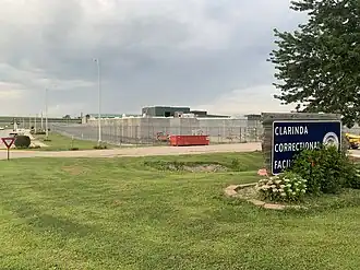 The Clarinda Correctional Facility is a correctional institution located in the Page County community of Clarinda, Iowa. It is in southwest Iowa on the grounds of the Clarinda Treatment Complex. As of January 22, 2017, the prison houses about 973 inmates, while another 137 are in the Lodged section, and the facility employs 287 people.