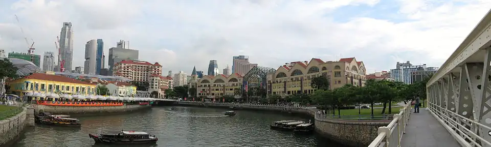 Panoramic view of Singapore River, with Clarke Quay on the left (northern) bank and Riverside Point on the right (southern) bank. Photograph taken from Ord Bridge, which can be seen on the extreme right.