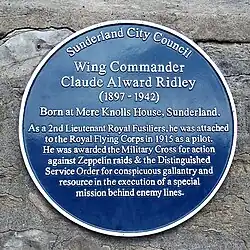 The home that Ridley lived in during his family's time in Sunderland had a blue plaque affixed to the wall in 2016.[21] Military Cadet organisations in the area of Essex around the former Stow Maries Aerodrome, compete in the Ridley Trophy competition annually by vying for timings on an assault course.[22][23]