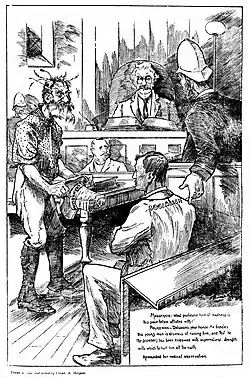During October and November 1903 Marquet's regular page-one feature cartoon was absent from The Tocsin, though the issue of 26 November included a double-page cartoon as a supplement, 'Symeism Versus Democracy', notated with "Drawn on zinc and etched by C. A. Marquet".[38] By mid-December 1903 Marquet's regular cartoons had resumed, appearing regularly until early May 1904 (but only occasionally after that).[39][40]