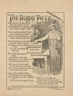 The Australian Worker issue of 5 October 1916 included an anti-conscription poem by William R. Winspear titled 'The Blood Vote'.[93] In the following week's issue Winspear's verse was republished, accompanied by an illustration by Marquet depicting a woman, with a conflicted look on her face, about to cast a 'Yes' vote, with a sinister demonic figure resembling Billy Hughes in the darkened background.[94][55] The illustrated verse was subsequently reprinted as a leaflet for the anti-conscription campaign and over a million copies were distributed.[88][95] The handbill was distributed nationwide by the anti-conscriptionist groups and "were pasted up all over the place". The Worker journalist Robert J. Cassidy later asserted that the illustrated poem "played a very considerable part in defeating the proposals of those who advocated throat-slitting by compulsion".[96][B]
