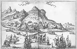An English squadron commanded by Sir John Berry entered the Caribbean and blockaded Saint Christophe.[10] The English fleet arrived off the Nevis point on 4 April 1667.[11] The English stayed out of range of the cannons of the fortifications, but kept frigates off the harbour of Saint Christophe to prevent any French ships entering.[12] Saint-Laurent wrote to inform La Barre of the dangerous situation on the island and the risk of famine.[13] In an effort to relieve the blockade La Barre and the governor of Martinique, Robert de Clodoré combined their forces with the Dutch commander Abraham Crijnssen.[14] The Franco-Dutch fleet sailed for Nevis, and engaged the English in the Battle of Nevis (20 May 1667).[10] La Barre caused a retreat through his incompetence, and Crijnssen left for Virginia in disgust.[10]