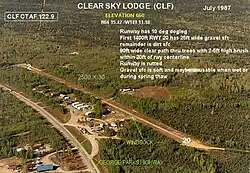 Clear Sky Lodge Airport has one runway designated 2/20 with a 2,500 by 20 ft (762 x 6 m) gravel and dirt surface. For 12-month period ending December 31, 2005, the airport had 800 aircraft operations, an average of 66 per month, all of which were general aviation.[1]