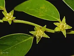 The inflorescence is a spike or fascicle produced in the leaf axils carrying very small 5-petaled flowers about 2 mm (0.079 in) diameter.[5][6][7]