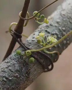 Clematicissus opaca was once classified as Cissus opaca, however a combination of genetic and morphological features led to it being placed within the genus Clematicissus.[3][1] As with the closely related Cissus, the vines climb by means of tendrils produced opposite each leaf. Minute flowers are produced on inflorescences that arise from branches of these tendrils. Flowers are followed by globular, black fruit, approximately 15 mm in diameter. These fruit are edible, though not especially palatable, and were occasionally used as food by Aborigines.[5][6]