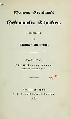 - Brentano, Clemens (1852). Die Gründung Prags. Frankfurt am Main: J. D. Sauerlander.