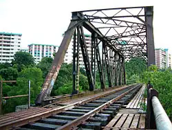 An iconic landmark at Clementi is the steel truss railway bridge crossing Sungei Ulu Pandan. It was once part of the Jurong KTMB Railway Line which was constructed to facilitate the transportation of manufactured products from Jurong to Malaysia, and raw materials from Malaysia to the industrial estate at Jurong. Construction of the railway began in 1963, and the first train ran in 1966. The Jurong section of the railway remained in use for the next four decades until its closure in the early 1990s. Today, the disused track continues to attract much interest from the public, especially people with a taste for history, nature and photography.