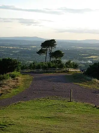 The Clent Hills are a hill range in Clent, Worcestershire, England. The closest towns are Stourbridge and Halesowen. The Clent Hills range consists of, in order from north-west to south-east: Wychbury Hill, Clent Hill (and Adams Hill), and Walton Hill (and Calcot Hill). The north Worcestershire range of hills continues eastwards to include Romsley Hill, Waseley Hills and the Lickey Hills.[2][3] The hills lie 10 miles (16 km) south-west of Birmingham.