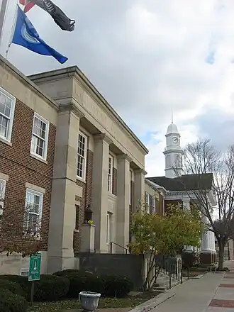 An addition behind the old courthouse[1] was finished in 1998. The design was approved by the commissioners and was submitted by Steinkamp, Steinkamp & Hampton. The building was designed in Greek Revival style and contains a central pediment supported by Tuscan columns with brick bases. The pediment contains an elliptical window. A drum rises from the roofline and is topped by a clock tower capped by a dome.