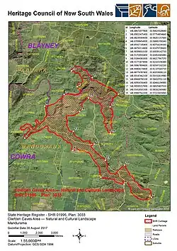 - ^ a b c d e f g h i j k l m n o p q r s t u v w x y z aa ab ac ad ae af ag ah ai aj ak al am an ao ap aq ar as at au "Cliefden Caves Area - Natural and Cultural Landscape". New South Wales State Heritage Register. Department of Planning & Environment. H01996. Retrieved 2 June 2018.