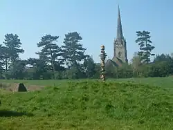 The parish church, dedicated to St Andrew, is a Grade I listed building.[21] Though nothing remains of the building mentioned in Domesday, some parts of the south wall date back to the year 1200, with traces of 13th century wall paintings. The church was enlarged into the shape of a cross in the first half of the 13th century. It was enlarged again in the 14th century. The tower was built in the first half of the 14th century, with a spire, reaching to a height of about 210 feet (65 m), added at some time during the century. The interior includes 14th century screens carved from oak; the rood screen is from the 15th century, as is some stained glass in one of the north windows. The church was restored by George Edmund Street in the second half of the 19th century, and again by W. D. Caroe in the early 20th century. In 1984 the spire was struck by lightning, with much damage to the church. Repairs were completed in 1987.[6][22]