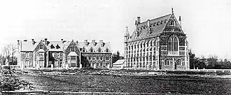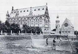 Hansom was called back in the 1870s and asked to design what is now the Percival Library and the open-cloister classrooms. This project was largely completed by 1875 – although the Wilson Tower was not built until 1890 (grade II listed[15]). Other buildings were added as follows:
